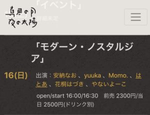 6/16(日) 「モダーン・ノスタルジア」 ■料金 前売 2300円 /当日 2500円 (1ドリンク別途) ■時間 16:00 オープン 16:30 スタート ■出演 安納なお、yuuka、Momo.、はとあ、花桐はづき、やないよーこ